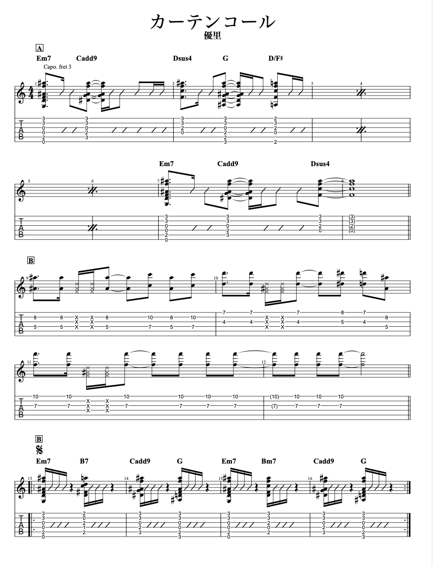 今回は、カーテンコール/ 優里のエレキギターフレーズを、TAB譜・コード・歌詞連動して練習できる内容をご紹介します。カポタストは3フレットです。『僕のヒーローアカデミア』7期第2クールOPテーマになっていますね。是非チャレンジしてみてください!